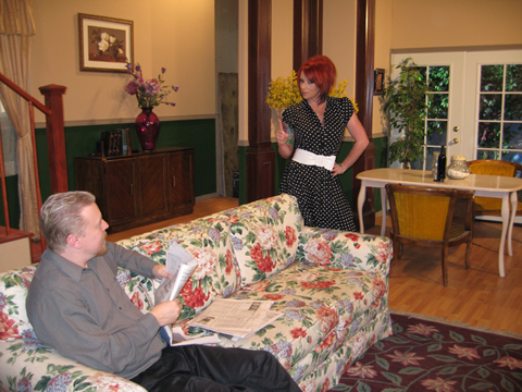 Returning to the crappy Van Nuys studio from our little field trip to steal the opening shot, we go directly into more connecting dialogue on the cheesy bedroom and living room sets.  Where some directors might have a script, Jim Powers just makes it up on the fly. He stands there in front of you, telling you what he wants you to say and you try to remember it all – at least just the basic gist of what he wants – but by the time he gets to the end of his tirade he is all excited and wide-eyed and has this stance – with his feet about 2 feet apart and his knees bent – his hands flailing around as he is talking – like a young boy and you are totally distracted and laughing and have forgotten the beginning of what he wanted. He actually has a shot list of sorts, if you can call it that… in reality it’s a numbered list scrawled on the back of what appears to be a page from someone else’s discarded script.  It’s hard to tell since it is in his frantically-waving hand.  I must say that at least his enthusiasm is appreciated; many people who have been directing for years don’t have that energy anymore, although I suspect the liquid enthusiasm had been flowing since, oh… around breakfast.