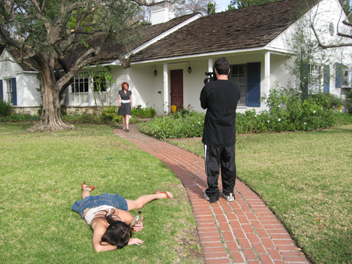 It was so old-school.  Peeking around the bush with Bobbi Starr and director Jim Powers I felt like time had turned back and I was on a Scotty Fox or Buck Adams shoot of yesteryear.  We watched Crash, the shoot PA (production assistant), stroll up the curving brick sidewalk of a nice house and knock on the door.  Moments earlier, in Powers’ SUV, Jim had handed Crash a twenty-dollar bill and told him to go ring the doorbell.  If someone was home Crash was to say we were making a student film and offer the owner $20 and ask if we could use the front of their house for a quick shot.  Crash turned around with a shrug, meaning no one was home so we ran into the yard, Bobbi Starr lying face down in the grass, short skirt askew with panties showing, “passed out” with a mostly empty bottle of booze.  I strut down the walk dressed like the perfect housewife, horrified that there is this lesbian passed out on our lawn.  What WOULD the neighbors think?!?