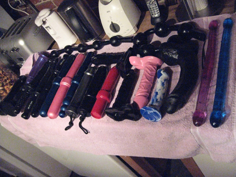 Before we even started shooting sex I made it perfectly clear to everyone, director, crew and talent alike that I’m allergic to latex.  This includes condoms and sex toys.  It’s not a terrible allergy; for instance it doesn’t bother my skin to wear a latex dress, but if you put a latex dildo (or condom or glove) into my pussy or my ass after about 20 seconds it starts to sting and burn.  And it continues to get worse, even after the offending latex object is removed.  At this point my bottom lip will start quivering and the waterworks turn on, tears spilling from my eyes.  It’s incredibly painful.  The next thing that happens is that my girl parts will begin to swell.  This is, y’know, bad when shooting a sex scene, for obvious reasons, and at that point I am done.  Nothing else is going in there, not without a great deal of pain and/or an hour or more of waiting and rinsing and aspirin.  I explained all of this to Jim, Johnny the PM, Crash the PA and all the girls.  I brought a suitcase full of my own personal toys of varying sizes, mostly of the extra large variety (yeah, I am a size queen sometimes, whaddya want?) so that there wouldn’t be any problems.  Sammie, who also has problems with latex, helped me go through the toys that Jim brought along and we picked out a few that were safe, but for the most part the toys to be used were mine.