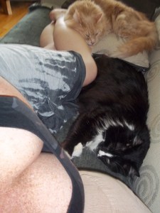 We survived AndyFest2011…barely. I was doing okay until the crossover day between AndyFest2011 and JanicePalooza (my best friend’s birthday celebrations) when I had an encounter with a Hula Hoop (see previous blog entry with photos)Even though I have been a star hula hooper since I was about 5, somehow I managed to injure myself hooping. I know, I know…of all things, right? I fucked up my shoulders/back and have been ouchy for days…today I visited my chiropractor and he put me back together however it triggered a migraine. At least I had my kitties to keep me company as I tried to recover….