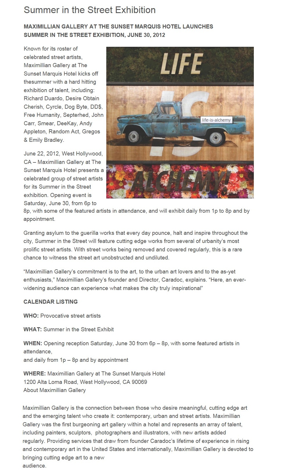 Jun 25 2012 My new art exhibition “Summer in the Street” I am launching my new art show THIS Saturday at Maximillian Gallery in West Hollywood, i hope that you all can come & see me & my view latest creations. Share this: Click to share on Facebook (Opens in new window) Facebook Click to share on X (Opens in new window) X Like Loading... Related